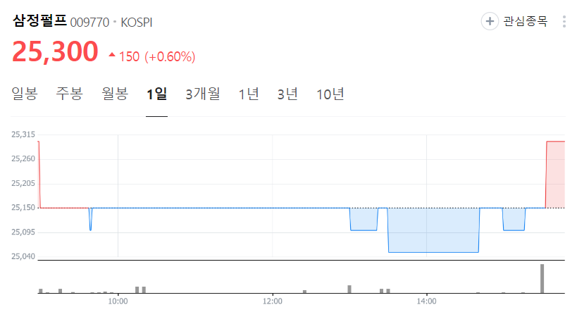 삼정펄프 현재 주가는 25,100원이며 전일 대비 -1.95원의 모습을 보이고 있습니다. 삼정펄프의 주주현황을 살펴보면 전성오 주주가 전체 지분 74.13%를 소유하고 있습니다. 삼정펄프는 가정생활용품 기업으로 장중 기준으로 주가는 25,100원 입니다. 삼정펄프의 시가 총액은 629억 원이며 발행 주식수는 2,499,971주 입니다. 외국인 보유 비중은 2.68% 이며 장중 거래량은 292원 을 기록했습니다. 매출액은 1,783억 원을 달성했습니다. EPS는 없음원이며 삼정펄프 주식 배당수익률은 0.19% 입니다.