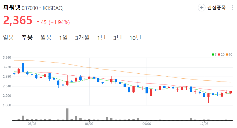 파워넷의 현재 주가는 2,320원입니다. 전일 대비 -7.94원 이동한 모습입니다. 시가 총액은 517억 원이며 발행 주식은 총 21,878,974주 입니다. 외국인이 보유한 비중은 0.40%입니다. 파워넷 기업의 영업이익은 억 원을 달성했으며 배당 수익율은 36% 입니다.