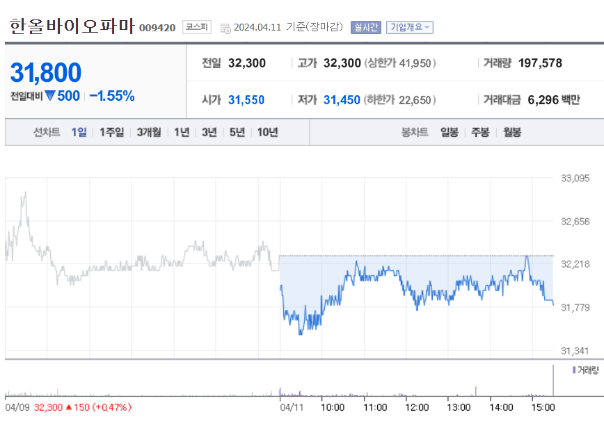 한올바이오파마 현재 주가는 32,300원이며 전일 대비 -16.32원의 모습을 보이고 있습니다. 한올바이오파마의 주주현황을 살펴보면 대웅제약 주주가 전체 지분 31.00%를 소유하고 있습니다. 한올바이오파마는 제약 기업으로 장중 기준으로 주가는 32,300원 입니다. 한올바이오파마의 시가 총액은 1조6874억 원이며 발행 주식수는 52,240,638주 입니다. 외국인 보유 비중은 6.03% 이며 장중 거래량은 206,643원 을 기록했습니다. 매출액은 1,349억 원을 달성했습니다. EPS는 163원이며 한올바이오파마 주식 배당수익률은 0.69% 입니다.