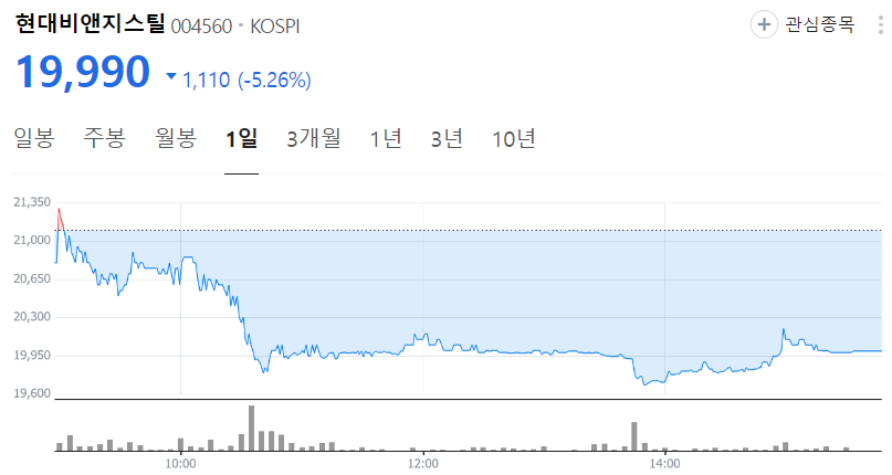 현대비앤지스틸 현재 주가는 21,000원이며 전일 대비 원의 모습을 보이고 있습니다. 현대비앤지스틸의 주주현황을 살펴보면 현대제철 주주가 전체 지분 45.98%를 소유하고 있습니다. 현대비앤지스틸는 금속 및 광물 기업으로 장중 기준으로 주가는 21,000원 입니다. 현대비앤지스틸의 시가 총액은 3167억 원이며 발행 주식수는 15,078,811주 입니다. 외국인 보유 비중은 2.86% 이며 장중 거래량은 150,470원 을 기록했습니다. 매출액은 10,453억 원을 달성했습니다. EPS는 없음원이며 현대비앤지스틸 주식 배당수익률은 684,918% 입니다.