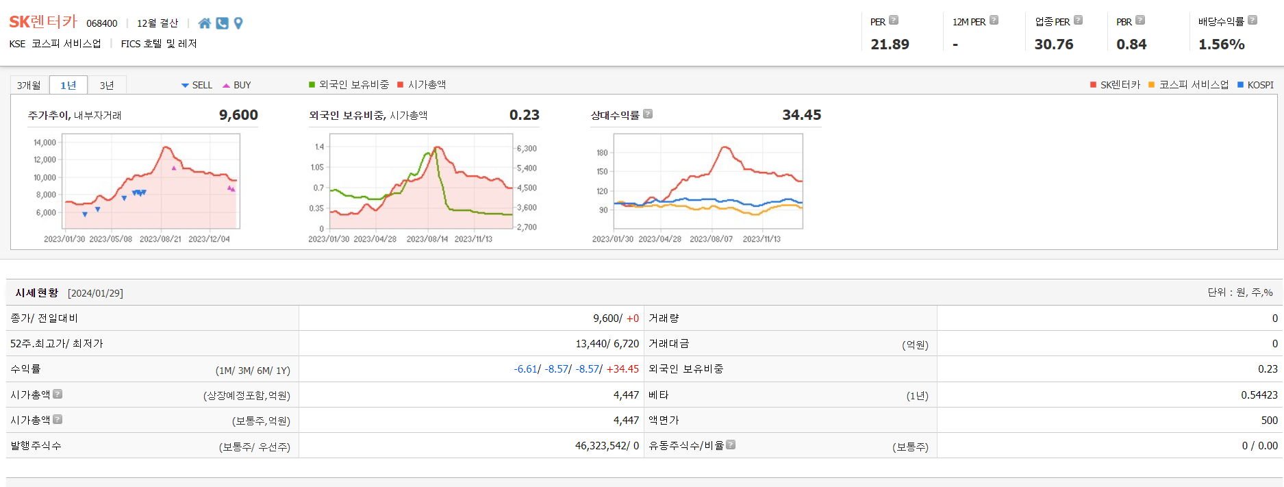 SK렌터카 현재 주가는 9,600원이며 전일 대비 -6.61원의 모습을 보이고 있습니다. SK렌터카의 주주현황을 살펴보면 SK네트웍스 주주가 전체 지분 100.00%를 소유하고 있습니다. SK렌터카는 호텔 및 레저 기업으로 장중 기준으로 주가는 9,600원 입니다. SK렌터카의 시가 총액은 억 원이며 발행 주식수는 46,323,542주 입니다. 외국인 보유 비중은 0.23% 이며 장중 거래량은 0원 을 기록했습니다. 매출액은 10,696억 원을 달성했습니다. EPS는 없음원이며 SK렌터카 주식 배당수익률은 957,743% 입니다.
